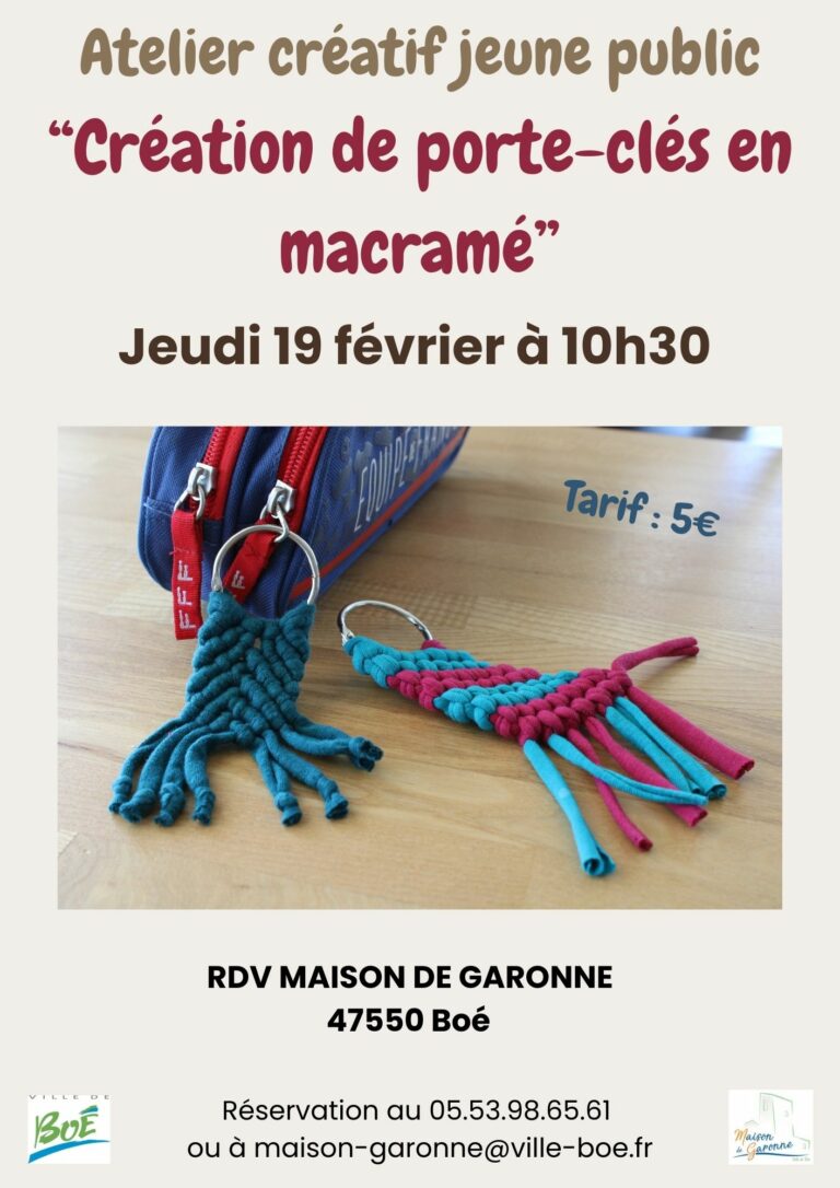 Jeudi 19 février à 10h30 : Atelier macramé – jeune public Atelier manuel de création de porte-clés en macramé. Un moment créatif où tu pourras t’amuser tout en participant à la réduction des déchets. Les participants repartent avec leur(s) création(s). >…